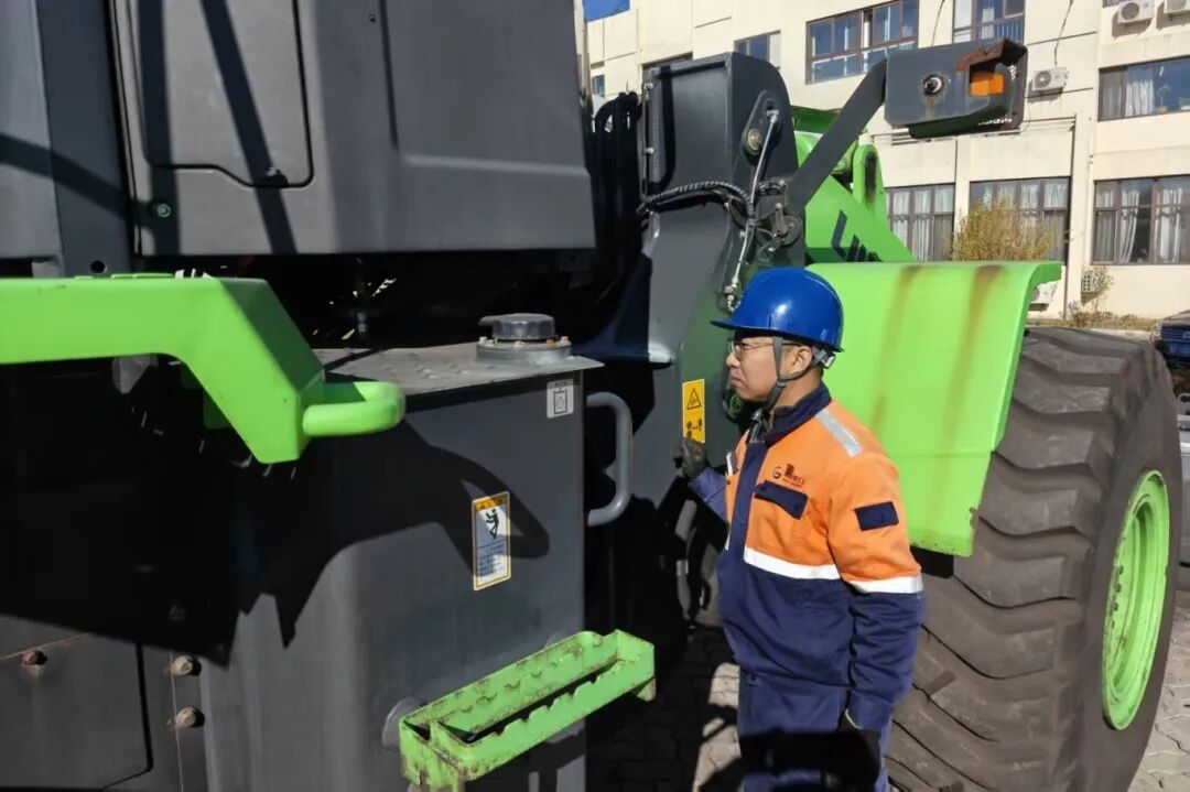 技术人员正在进行电动装载机液压油、润滑点位和电气线路检查