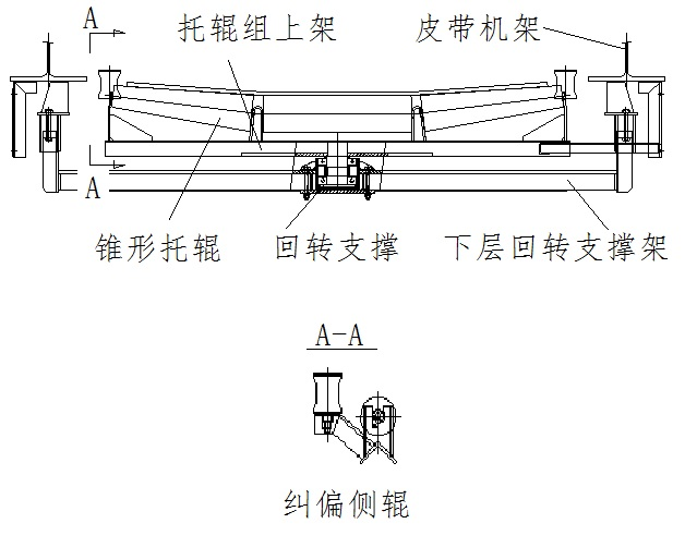 此托辊组主要由一个槽型托辊组、回转支撑架以及纠偏侧竖托辊组成。槽型托辊组由一个水平托辊以及两个带锥托辊组成,具体构成见下图5调心纠偏托辊组: