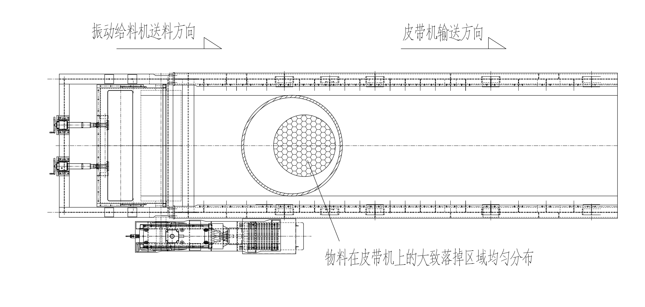 起重设备上的皮带机,往往设计有旋转或者伸缩功能,用于满足对地面不同输送线的切换。以旋转皮带机为例,其输送方向和振动给料机送料方向相同时(见图3),物料能均匀的落在皮带上;但是当皮带机旋转后和振动给料机送料方向出现夹角(见图4),物料落料点则明显偏到了皮带的一侧。这种状态下皮带受力不均,也会导致皮带往此侧偏斜造成皮带机整体跑偏。